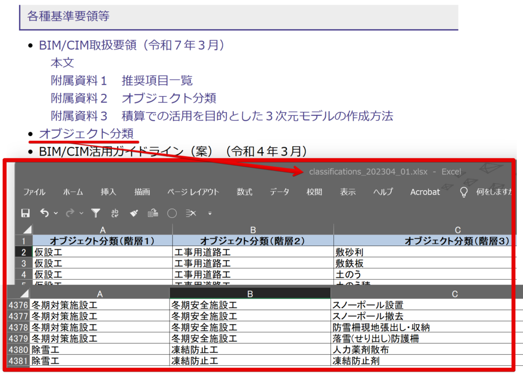 オブジェクト分類名は階層1~3があり、名称は「BIM/CIMポータルサイト | 国土交通省」の以下のExcelデータから確認できます。